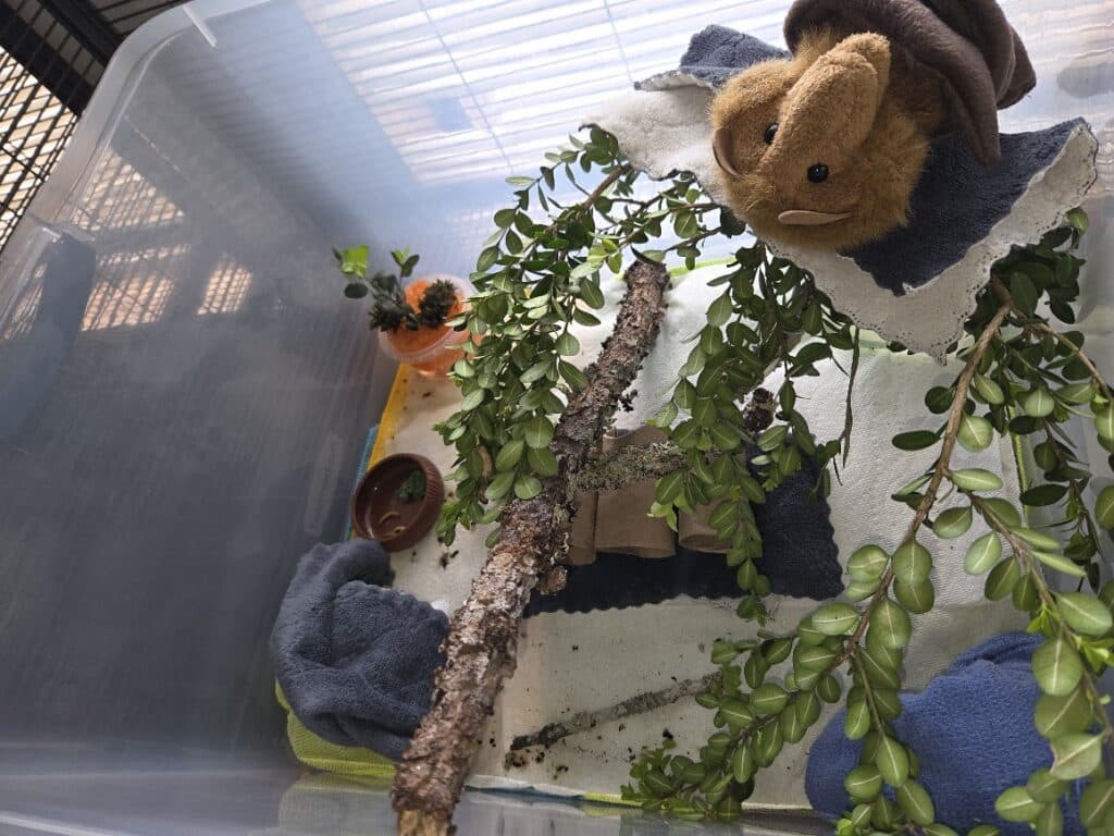 Sasha the Porch ‘Possum was a regular visitor to a family’s porch, but disappeared for a month. When she returned she had an eye injury, a head wound, and, as it turned out, a pouch full of baby beans. She seems to be in good spirits and healing well. She’s been moved to an outside enclosure to enjoy fresh air and room to move. Her babies are still so small I haven’t seen them, but you can feel them when you touch her belly. So rude!