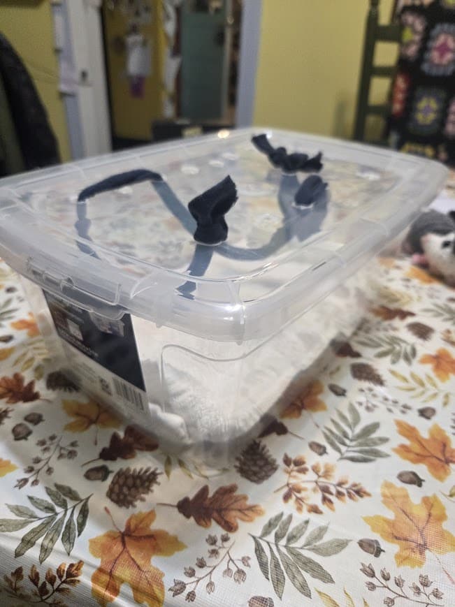 Diane from Jasper found an injured bat at work and created this thoughtful container for him.  It was lined with a soft towel, holes carefully cut for air, and a piece of fabric woven through for him to hang on.  She also put a little dish of water in for him and fed him live mealworms with tweezers.