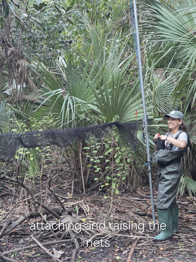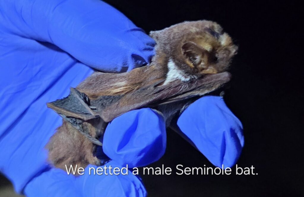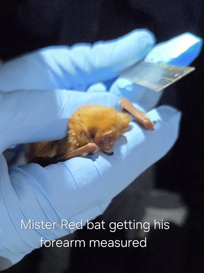 The groups I went out with netted 3 bats in 3 nights, but others netted up to 22! The total netted over 3 nights at 30 sites was around 180. The bats were of diverse species including Seminole, Red, Yellow, Big brown, and Brazilian freetail, also known as Mexican freetail. The bats are unharmed and handled by experienced bat biologists wearing personal protective equipment and following standardized protocol. Data collected is only useful if done properly and following the same guidelines and parameters. Otherwise as compelling as it may be, it can’t be used.