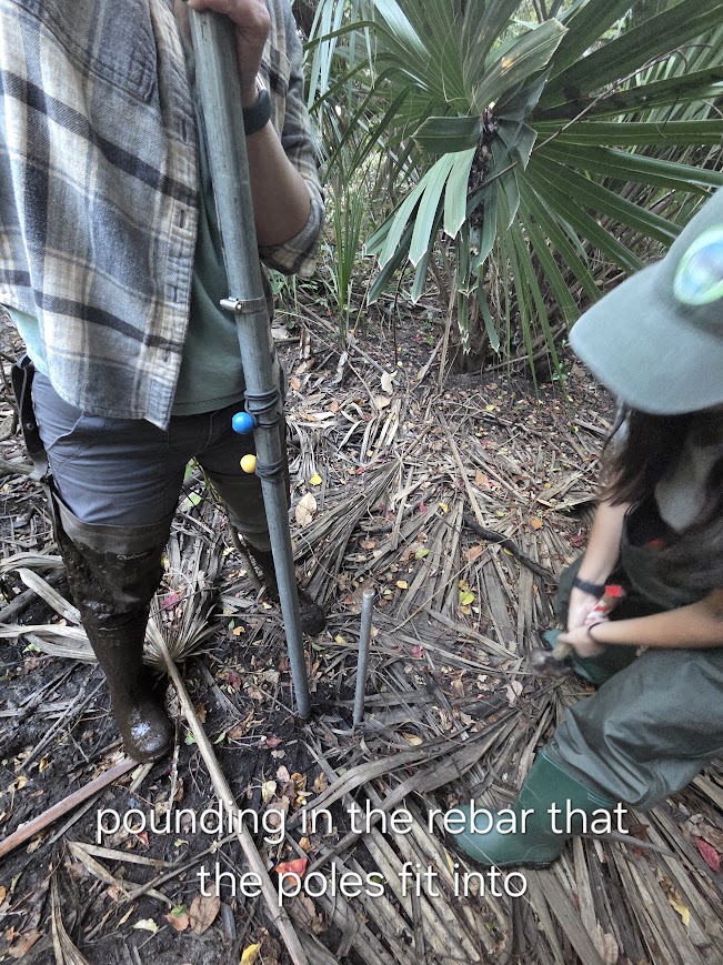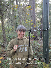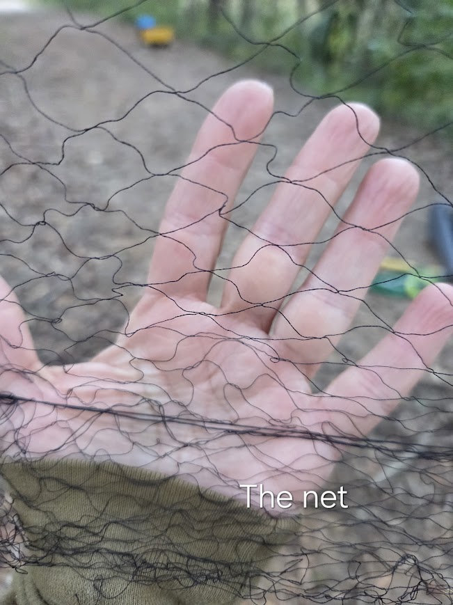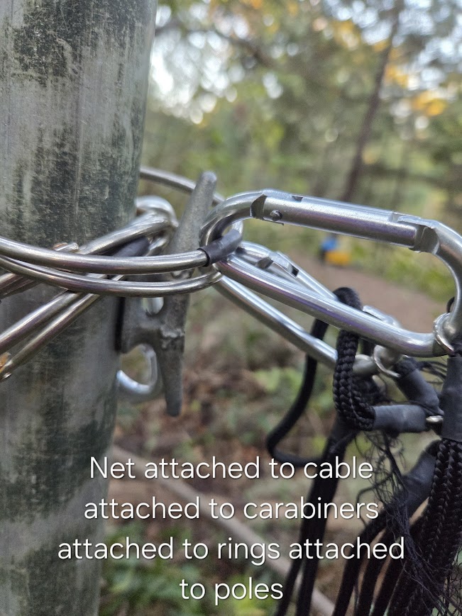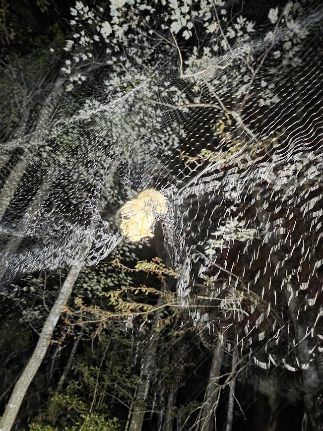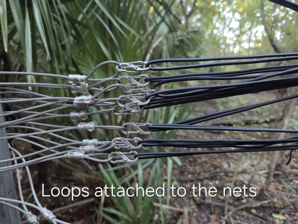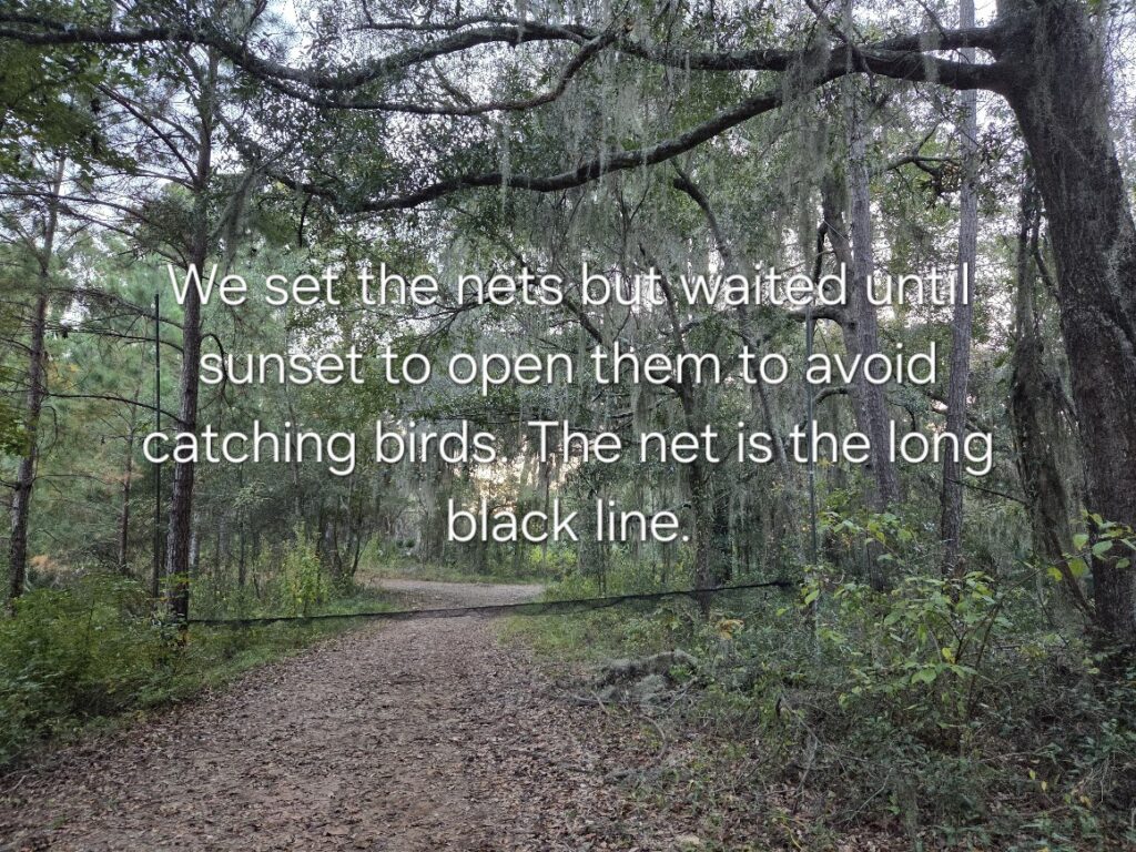 I took as many photos detailing the installation and set up of the nets as I thought would give you an idea of the process. Ideally it’s an at least 4 person job and can’t be hurried or abbreviated. The nets are strung tight enough that they don’t drag in the brush or on the ground, but loosely enough so that retrieving netted animals is easier.