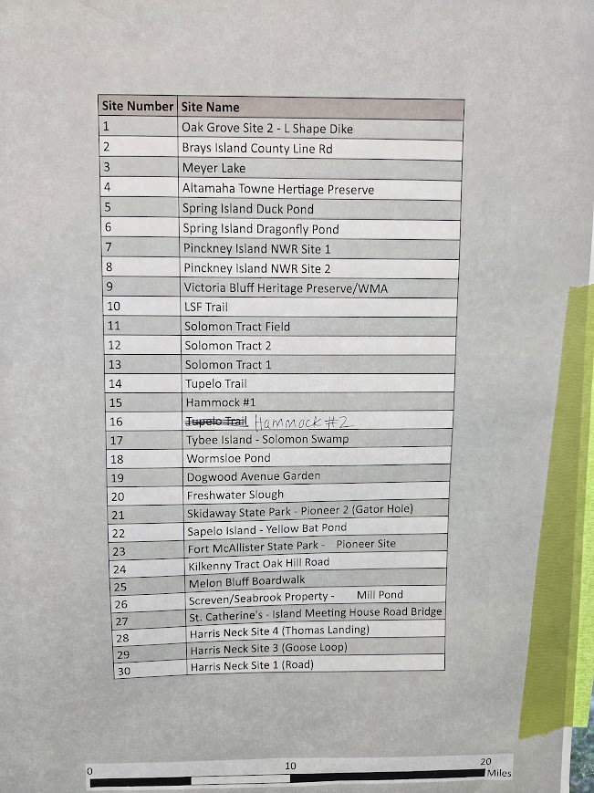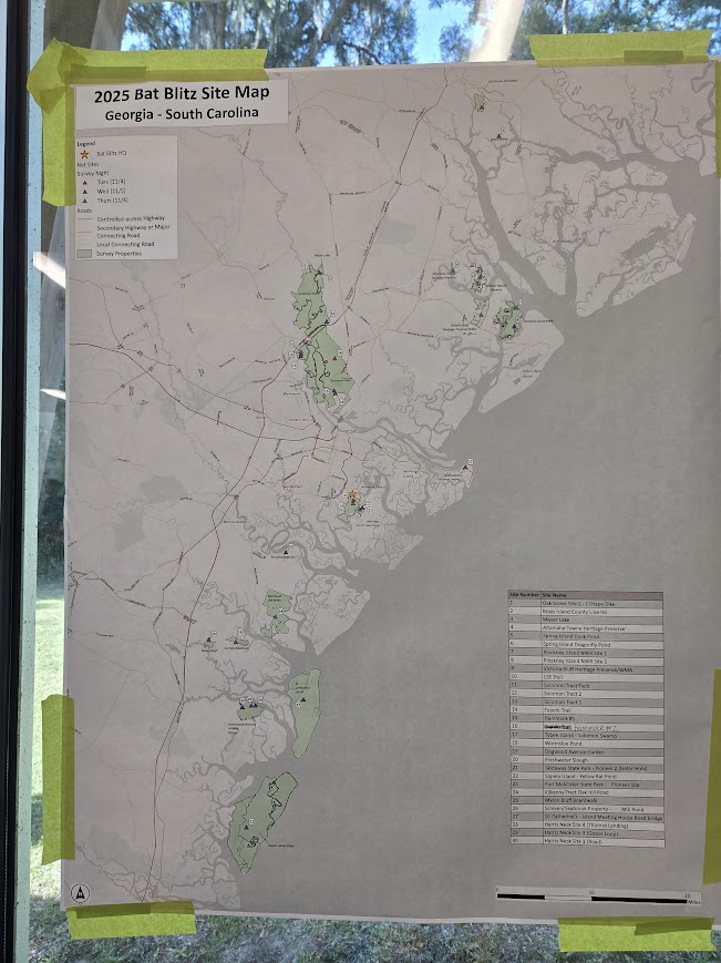 After extensive and thoughtful research, 30 sites were chosen from the greater Savannah area. These were the ones most likely to have resident bats. They included the Wormsloe property, state parks, nearby islands, the Savannah National Wildlife Refuge, and on private property.